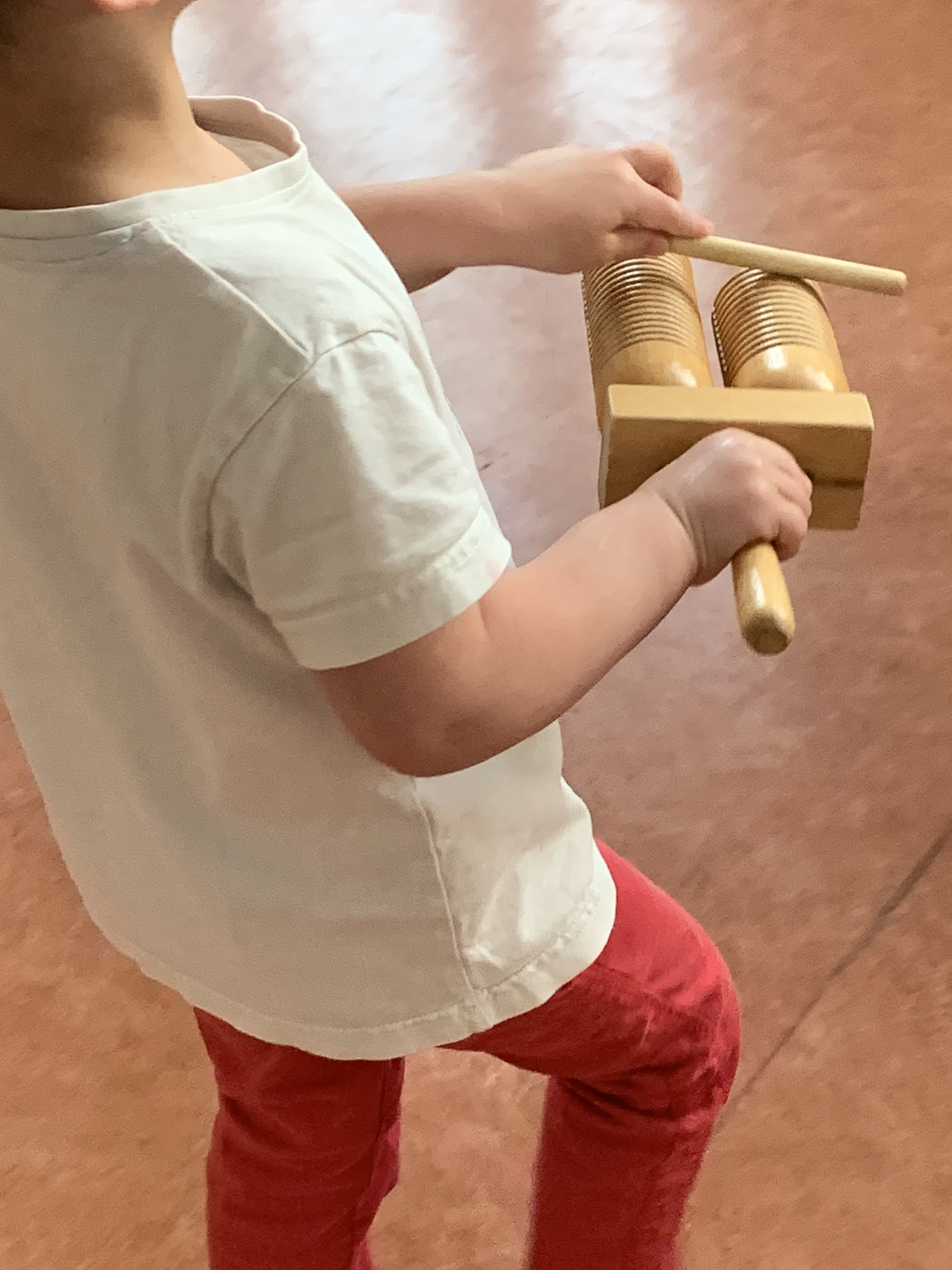 Produire de la musique par le mouvement est pour l’enfant extrêmement satisfaisant : cette proposition répondant à ses besoins de développement (les « périodes sensibles »), l’enfant fait preuve de grande concentration et développe, en plus de ses capacités de centrage, sa conscience de la pulsation, du rythme et de la durée des sons.